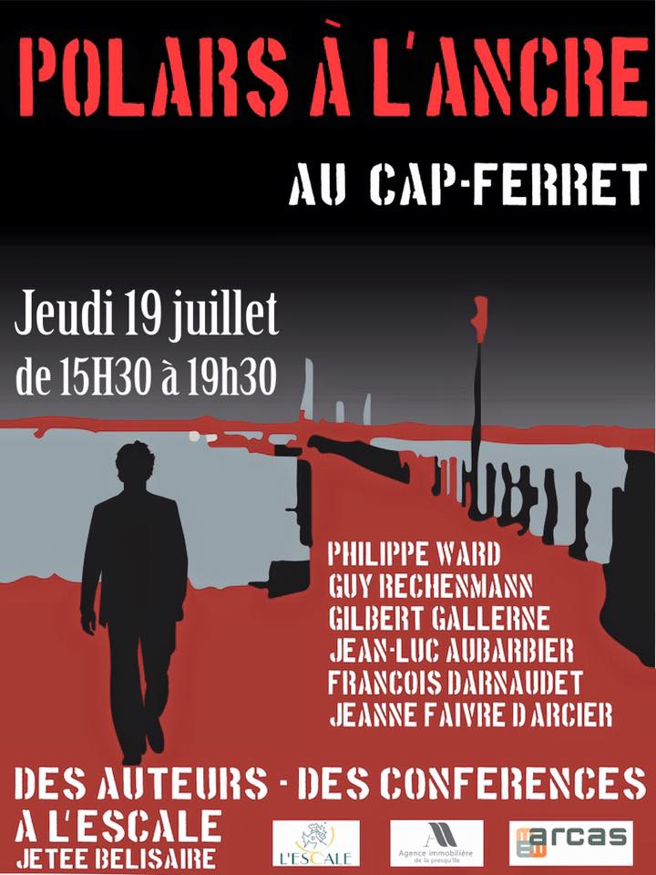 Jeudi 19 juillet 2018, de 15h30 à 19h30, je participerai au salon POLAR A L’ENCRE au CAP FERRET (restaurant L’Escale, face à la jetée Bélisaire). Débat autour du Polat avec Guy Rechenmann et Philippe Ward, et dédicaces de mes thrillers publiés chez City Hachette: « Le complot de l’Aube Dorée », « La vengeance de Gaïa », « Le Testament Noir » et « L’échiquier du Temple ».