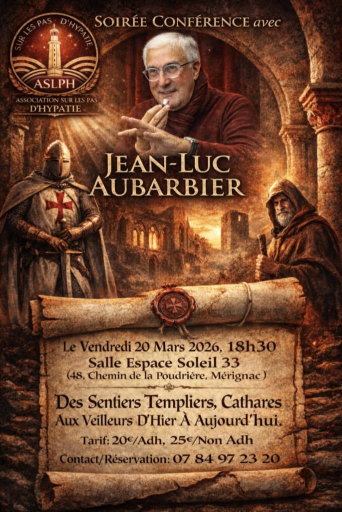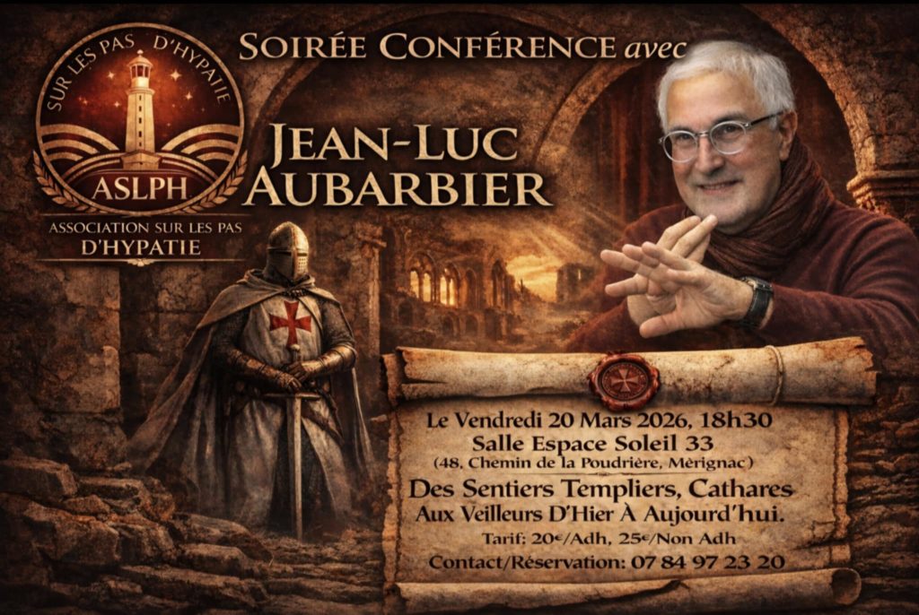 Le vendredi 20 mars 2026, à 18h30, je donnerai une conférence sur le thème « Des sentiers templiers et cathares aux veilleurs d’aujourd’hui », autour de mes thrillers ésotériques que je présenterai dans leur ensemble. Organisée par l’association Sur les Pas d’Hypatie, la conférence aura lieu à la salle Espace Soleil 33, 48 chemin de la Poudrière à Mérignac. réservation 0784972320. Une séance de dédicaces, organisée par la librairie Pégase, à Bordeaux, aura lieu après la conférence.