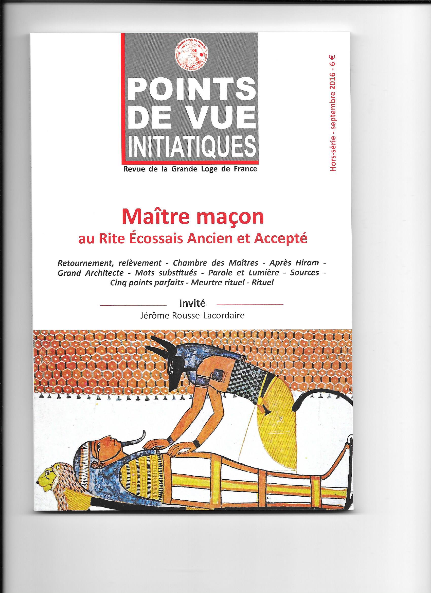La revue Point de Vue Initiatique a publié en septembre 2016 un numéro spécial 3e degré « Maitre Maçon au Rite Ecossais Ancien et Accepté ». J’y signe un article intitulé « Le meurtre rituel: cousinages, parentés, influences » où je développe l’aspect universel du sacrifice humain, les phénomènes de substitution (le bouc émissaire) et le thème de la balade de maître Manole qui a trait aux opératifs. Un grand nombre d’articles tous plus passionnants les uns que les autres complètent ce volume (du retournement au relèvement, les mots substitués, la légende d’Hiram et ses sources, apparition du grade de maître, etc). Le volume est en vente à la Grande Loge de France (siège de la revue Point de Vue Initiatique) 8 rue Puteaux 75017 Paris.
