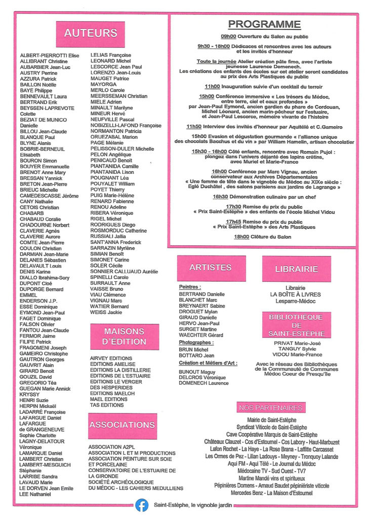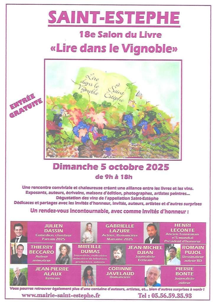 Le dimanche 5 octobre 2025, de 9h à 17h, je participerai au salon du livre de Saint-Estèphe, en Gironde, en compagnie de cent vingt auteurs, dont Corinne Javelaud, Jean-Pierre Alaud, Pierre Bonte, Mireille Dumas, Gabrielle Lazure (marraine), Julien Dassin (parrain de la manifestation), Thierry Beccaro, Henri Leconte, Jean-Michel Djian, Romain Pujol, Bernard Duporge, Dominique Faget, Georges Gautron, etc.